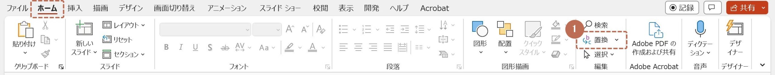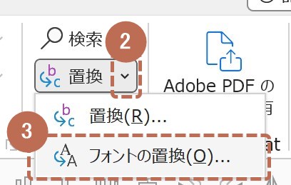 『フォントの置換』機能は、[ホーム]タブの右側にある[置換]の中にあります。(❶参照)