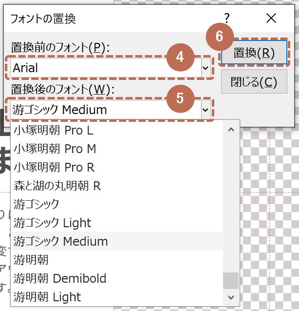 最後に、[置換]ボタンをクリックすると、全スライドに対してフォントの置き換えが行われて完了です!(❻参照)