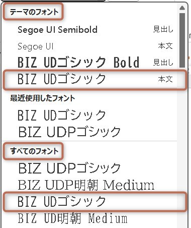 反映されなかったテキストオブジェクトを、フォント一覧に表示された「テーマのフォント」に変更するには、ちまちまと手作業で行う必要があります。